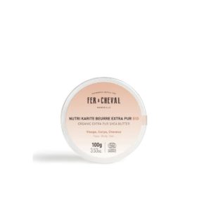 Sans parfum, colorant ou conservateur, le Nutri Karité Beurre Extra Pur Bio de Fer à Cheval s’applique sur vos cheveux et votre peau (visage & corps). Le beurre de karité est reconnu pour ses vertus nourrissantes, réparatrices et apaisantes. Cont. 100 g. Composition : Beurre extra pur bio*, sans parfum, colorant ou conservateur. *Ingrédient issu de l’agriculture bio.
