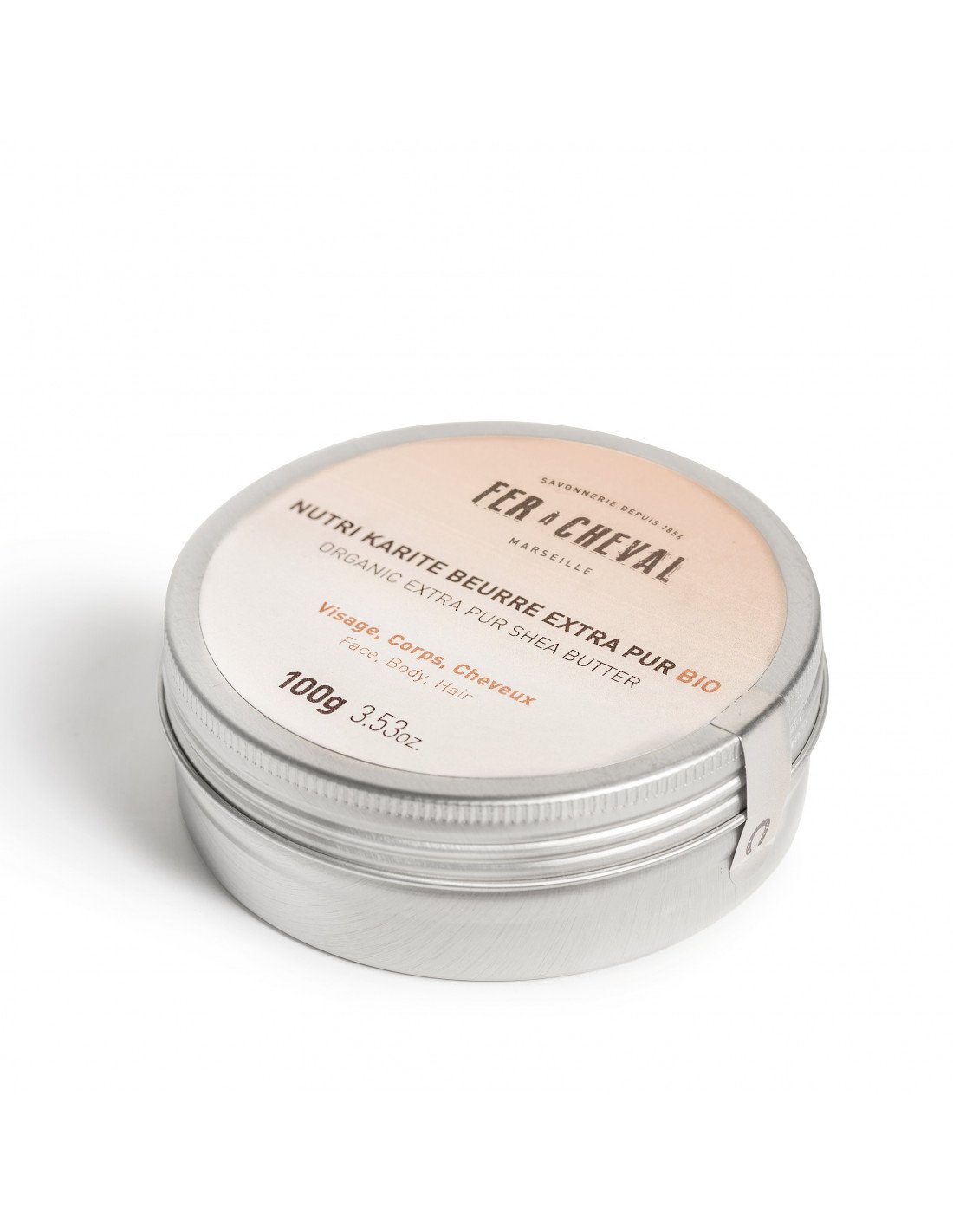 Sans parfum, colorant ou conservateur, le Nutri Karité Beurre Extra Pur Bio de Fer à Cheval s’applique sur vos cheveux et votre peau (visage & corps). Le beurre de karité est reconnu pour ses vertus nourrissantes, réparatrices et apaisantes. Cont. 100 g. Composition : Beurre extra pur bio*, sans parfum, colorant ou conservateur. *Ingrédient issu de l’agriculture bio.