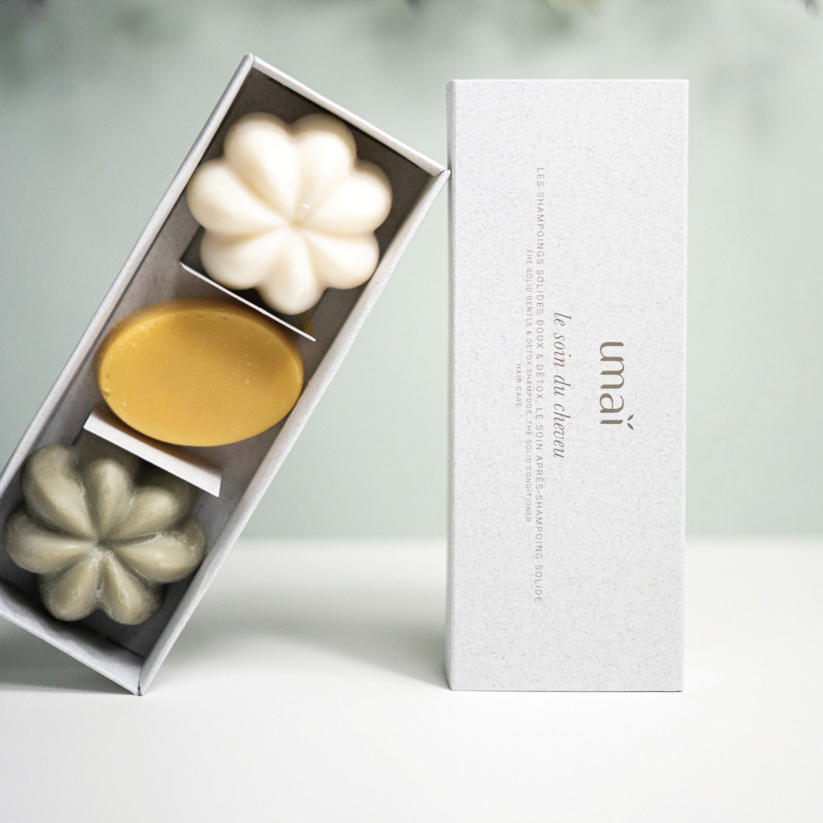 Ce coffret contient un shampoing solide doux, un shampoing solide détox et un soin après-shampoing pour démêler.